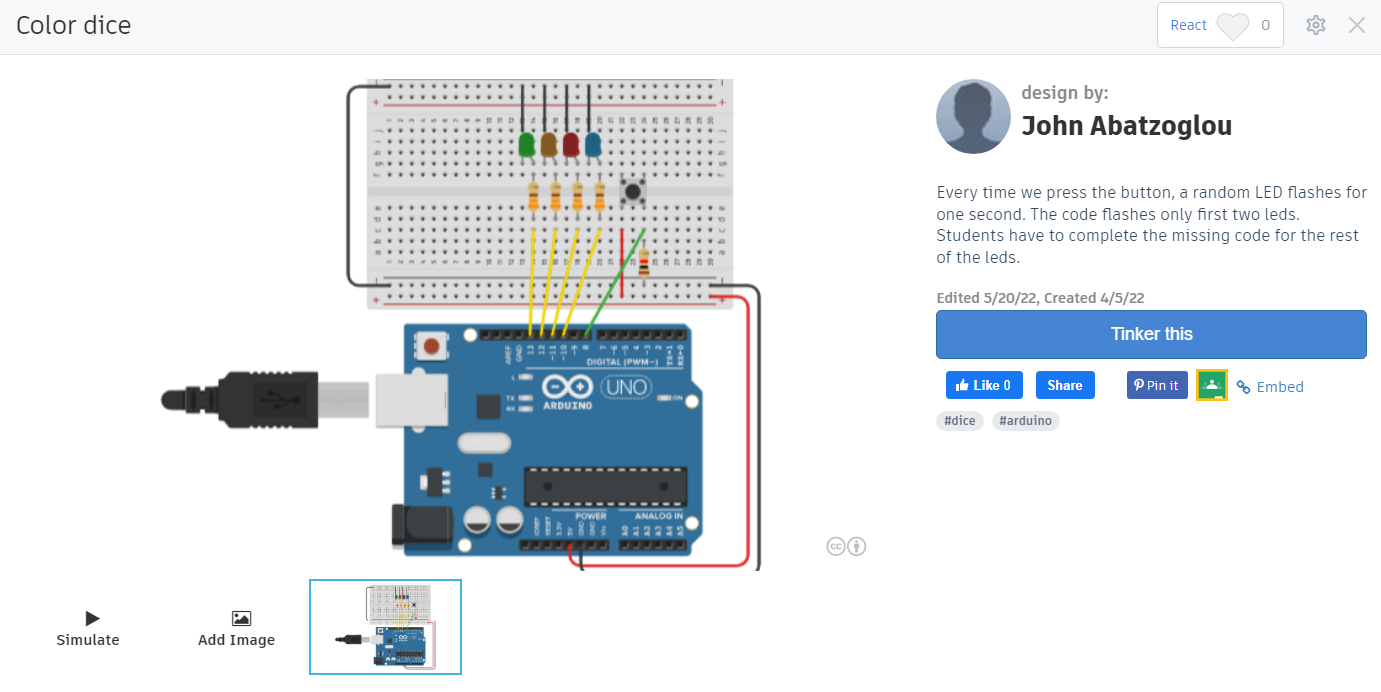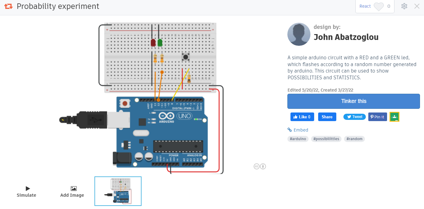 | Description: | The aim of this scenario is to introduce 12-13 year old students to the concept of probability through a simulation using an arduino microcontroller. The students will experiment to realize the difference between a random experiment and a deterministic experiment. They will experimentally calculate the probability of equally likely and non-equally likely events using the law of large numbers.They will have the opportunity to observe and adjust the arduino code during the execution of the experiment. |